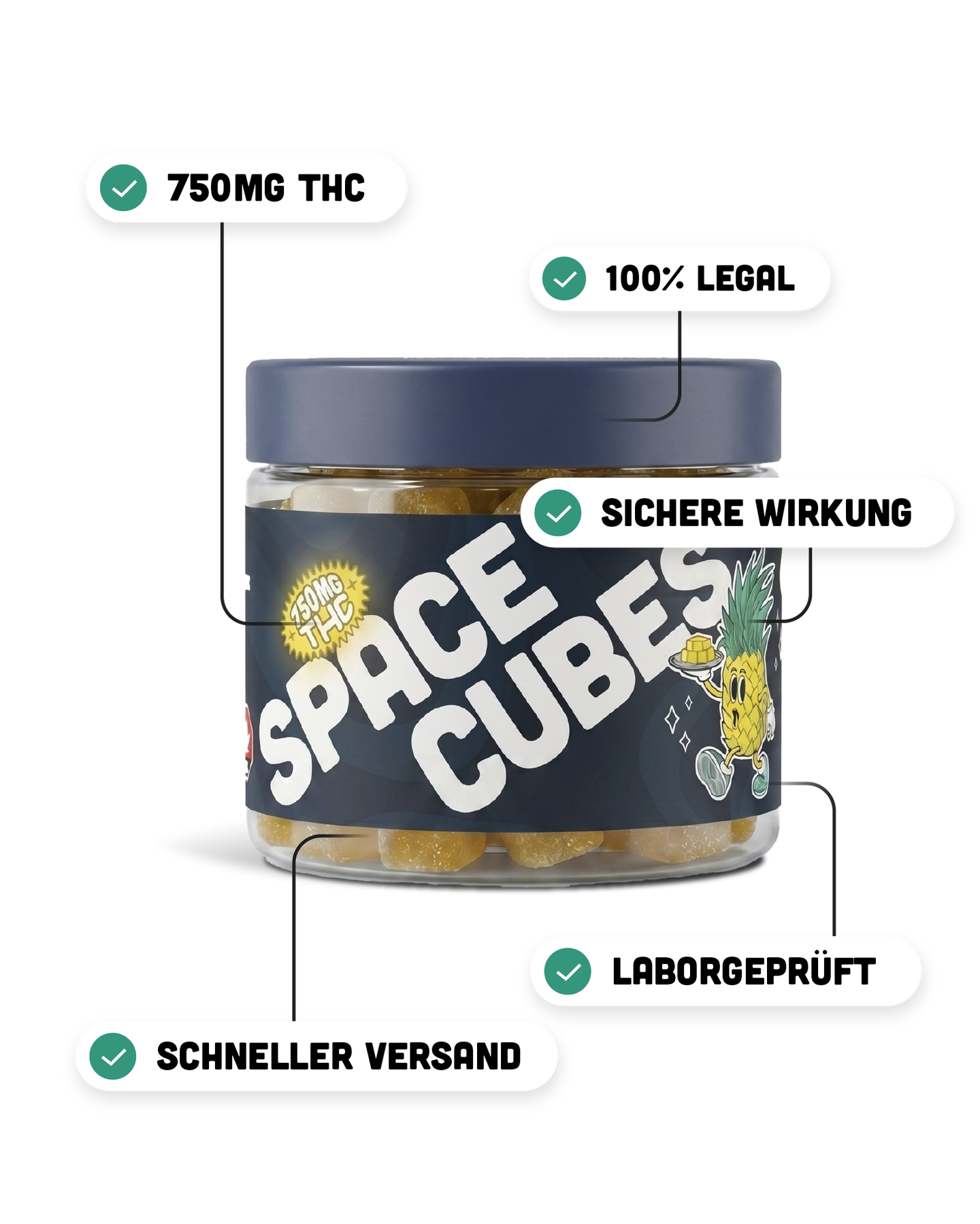 THC und CBD zusammen wirken anders als THC allein. CBD dämpft die psychoaktiven Spitzen und sorgt für einen runderen, entspannteren Effekt — weniger Overload, mehr Kontrolle. Die 1:1-Ratio in den Space Cubes ist kein Zufall, sondern Absicht.
