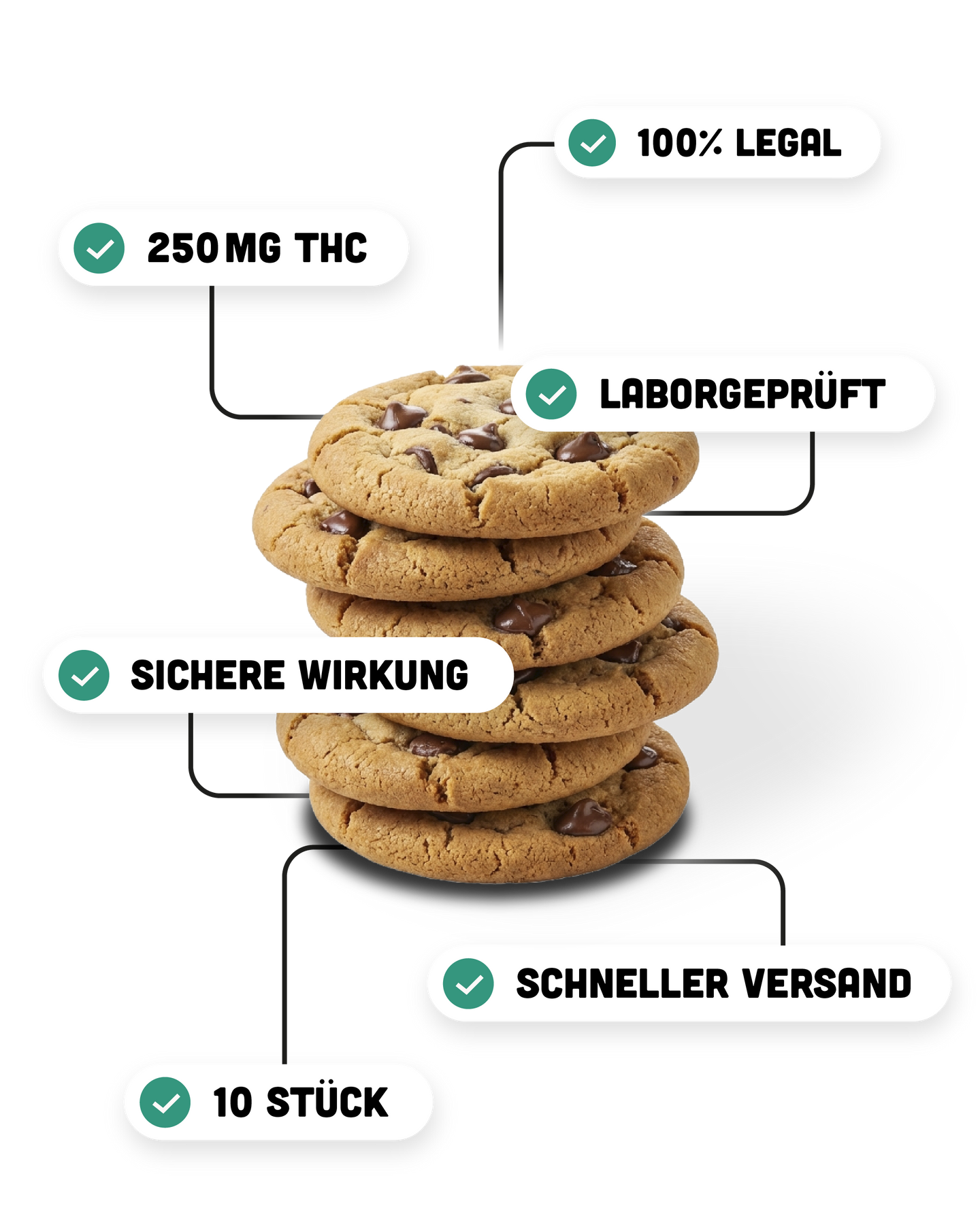 Unsere THC Cookies enthalten natürlich gewonnenes THC unter 0,3 % und sind damit in Deutschland legal erhältlich. Jeder Cookie ist präzise dosiert und laborgeprüft. Ideal für alle, die eine rauchfreie Alternative suchen.